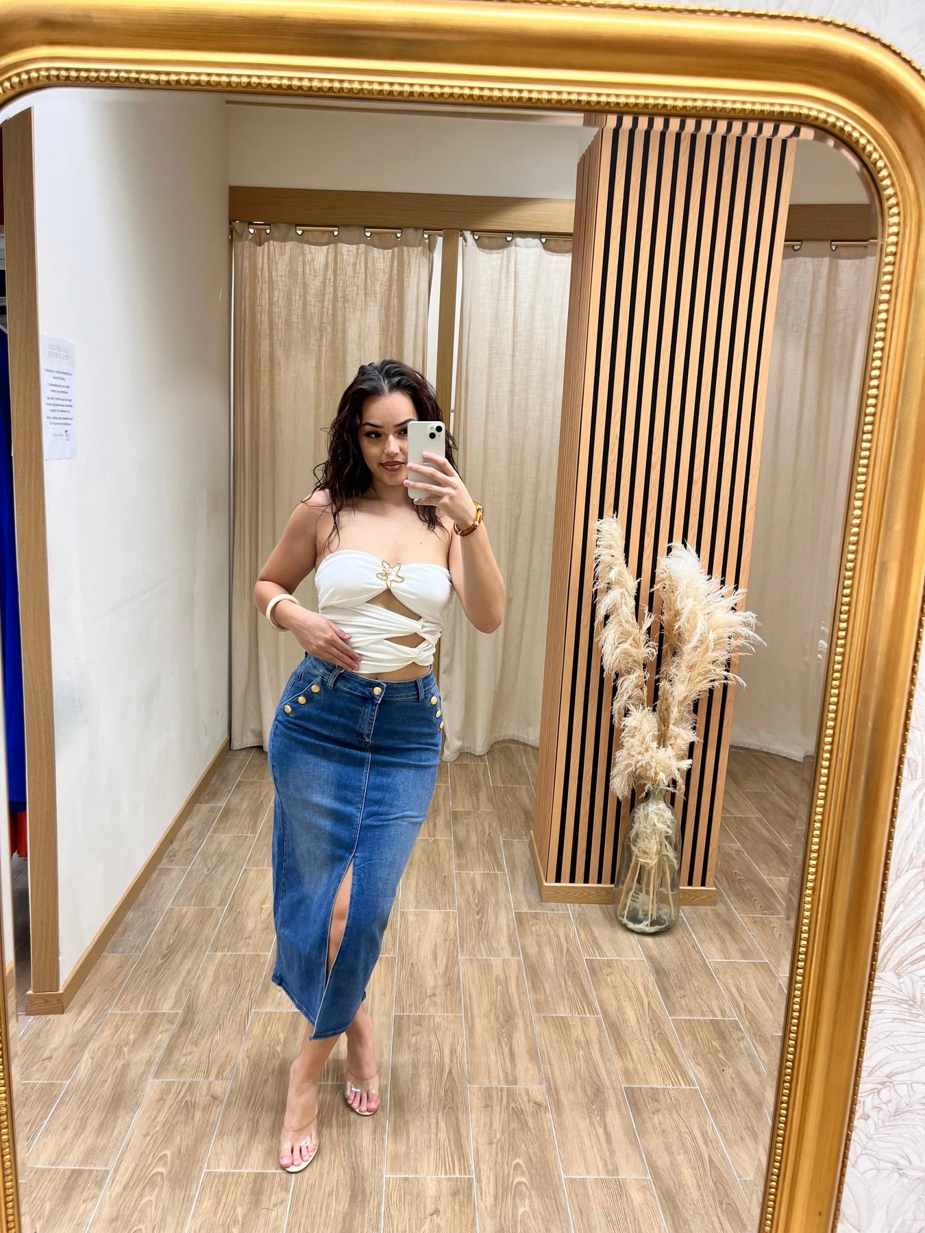 Alliant féminité et audace, cette jupe crayon en denim offre une silhouette élancée et moderne. Sa taille haute souligne les courbes avec élégance, tandis que sa fente frontale apporte une touche sensuelle et contemporaine. Une pièce versatile, idéale pour un look urbain chic, une sortie en soirée ou une tenue raffinée du quotidien.