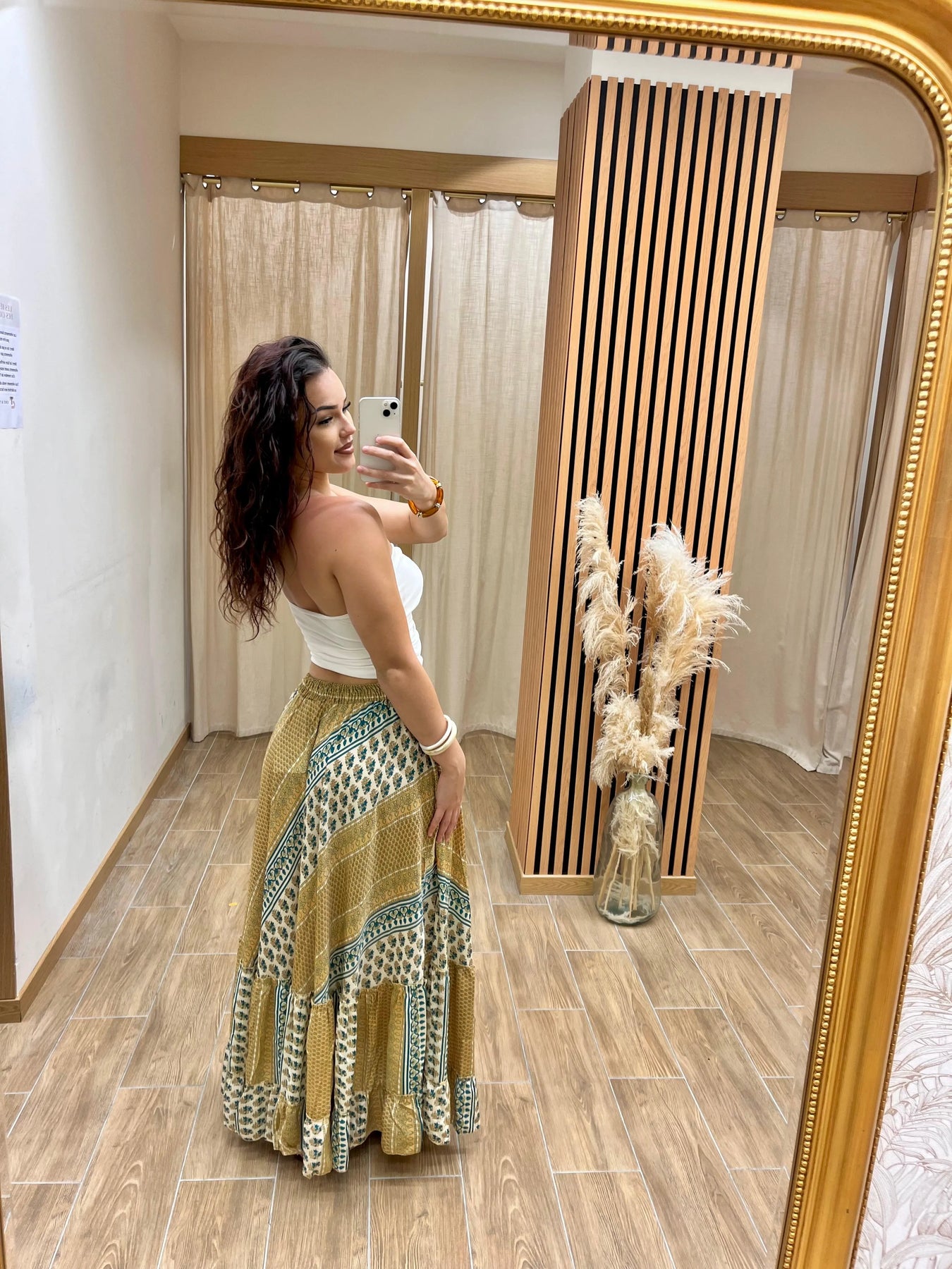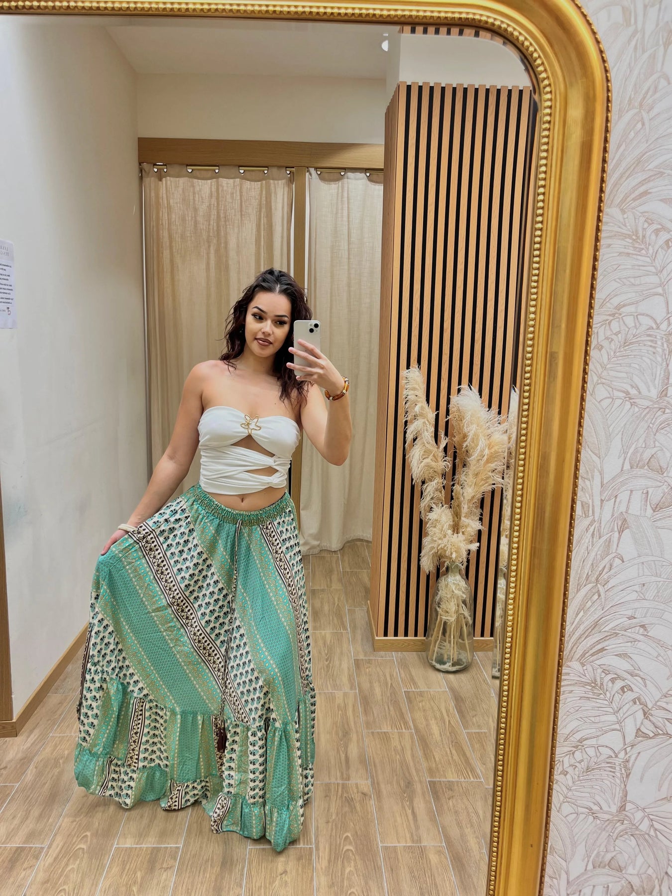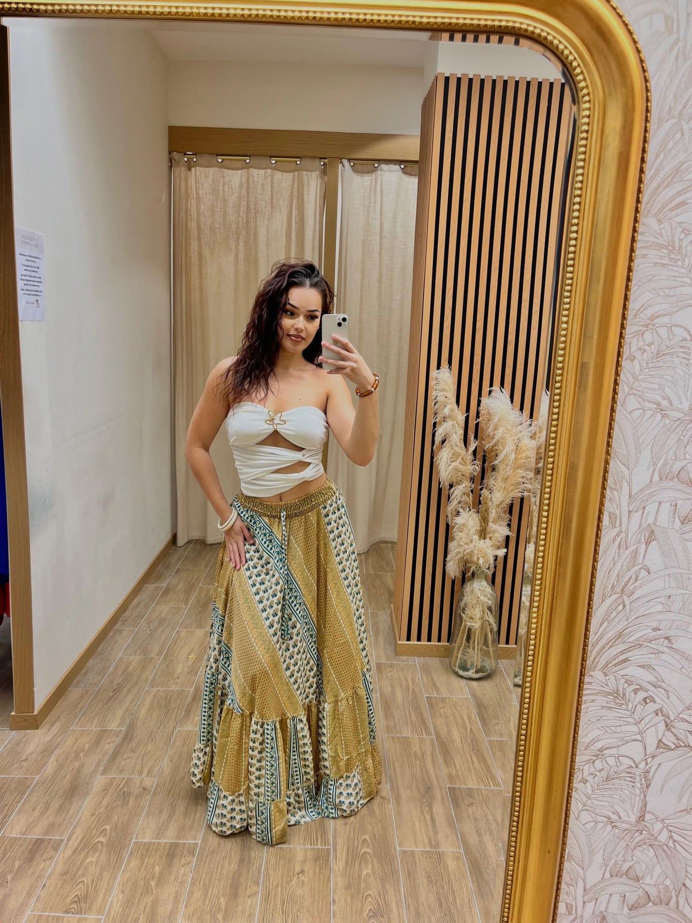 Libre et légère, cette jupe longue au charme bohème invite à la flânerie élégante. Sa coupe ample ondule à chacun de vos pas, insufflant un esprit voyageur et raffiné. Parfaite pour un brunch estival, une balade au bord de mer ou une escapade romantique, elle habille avec naturel tout en offrant un confort aérien.