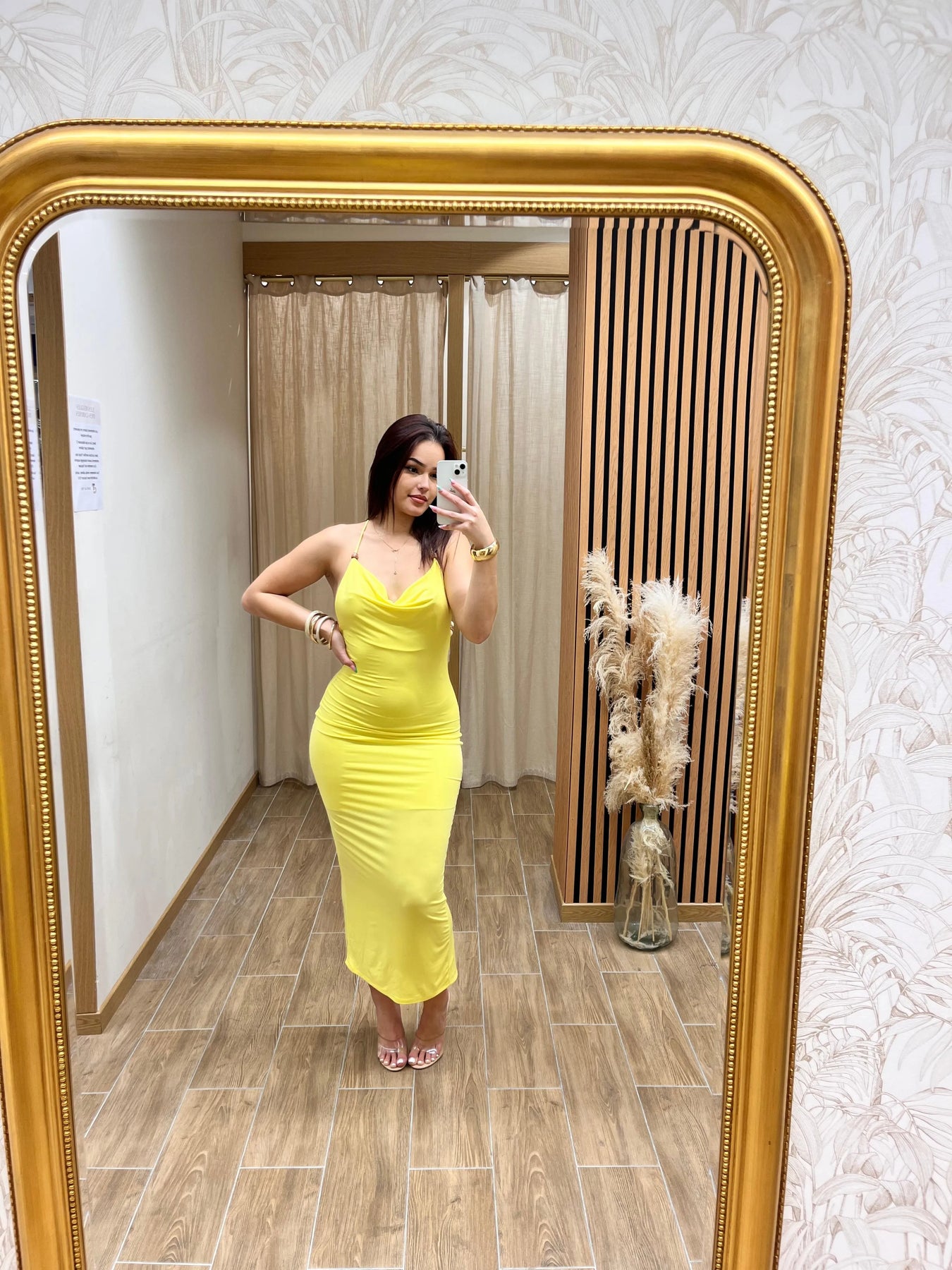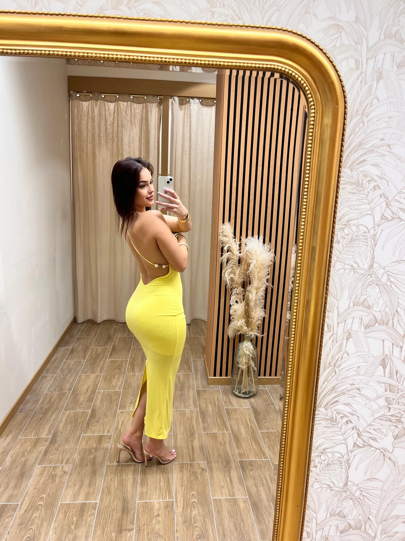 Éclatante et féminine, cette robe longue jaune près du corps illumine la silhouette avec sa coupe ajustée et son décolleté drapé élégant. Son dos nu avec fines bretelles croisées apporte une touche glamour, tandis que la fente arrière subtile assure confort et allure. Parfaite pour une soirée estivale, un cocktail chic ou une cérémonie élégante, elle met en valeur les courbes avec raffinement.
