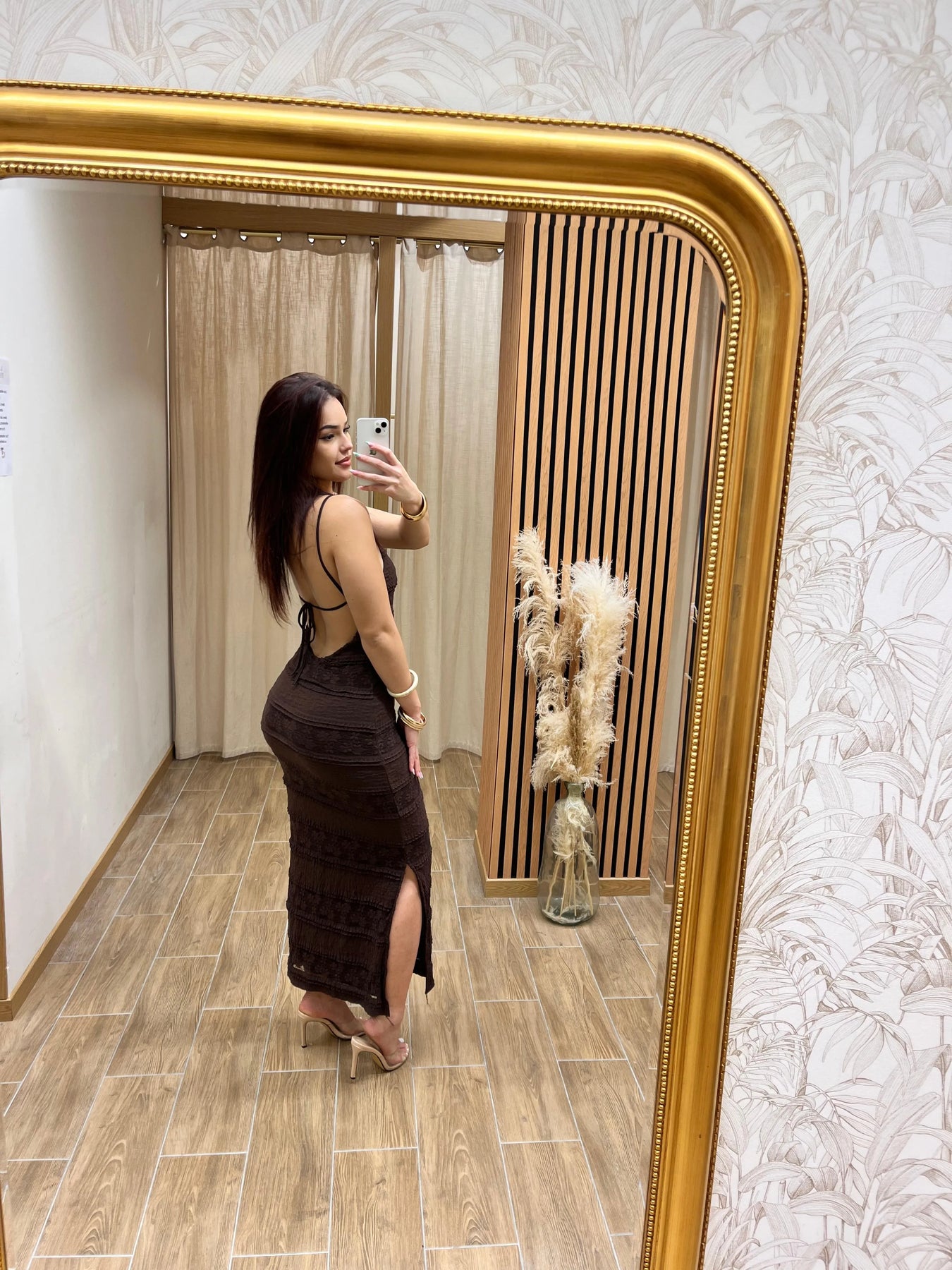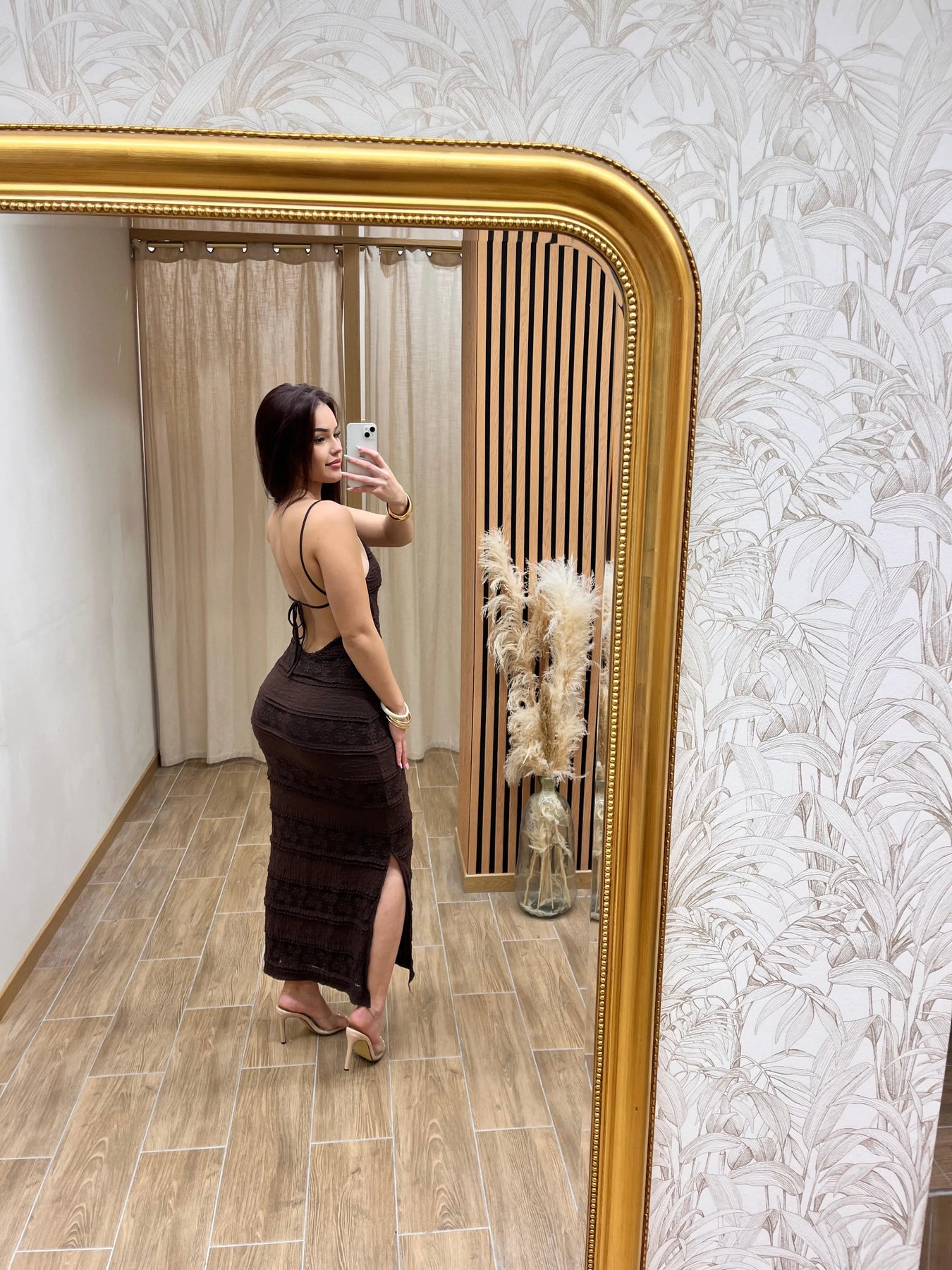 Élégante et sensuelle, cette robe longue marron près du corps épouse parfaitement les formes grâce à sa matière extensible et raffinée. Son dos nu à fines bretelles croisées apporte une touche glamour, tandis que sa fente latérale dévoile subtilement la jambe. Parfaite pour une soirée chic, un cocktail élégant ou un événement spécial, elle combine féminité et confort.