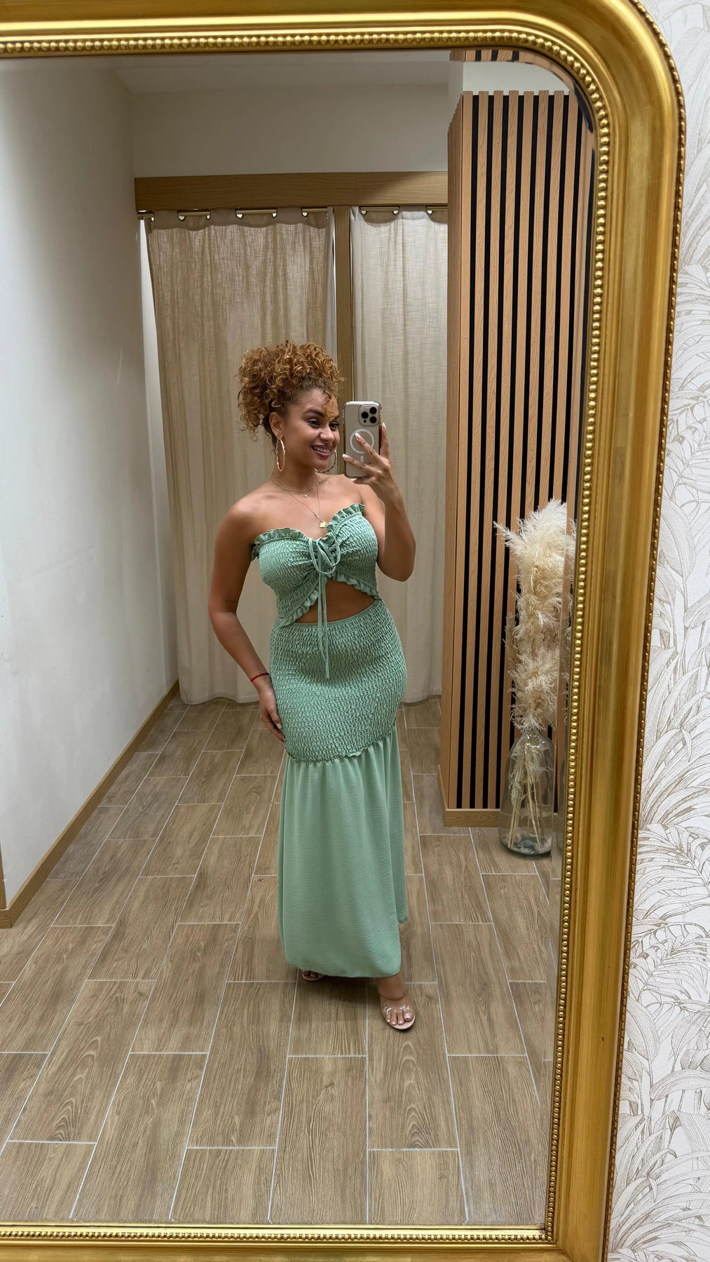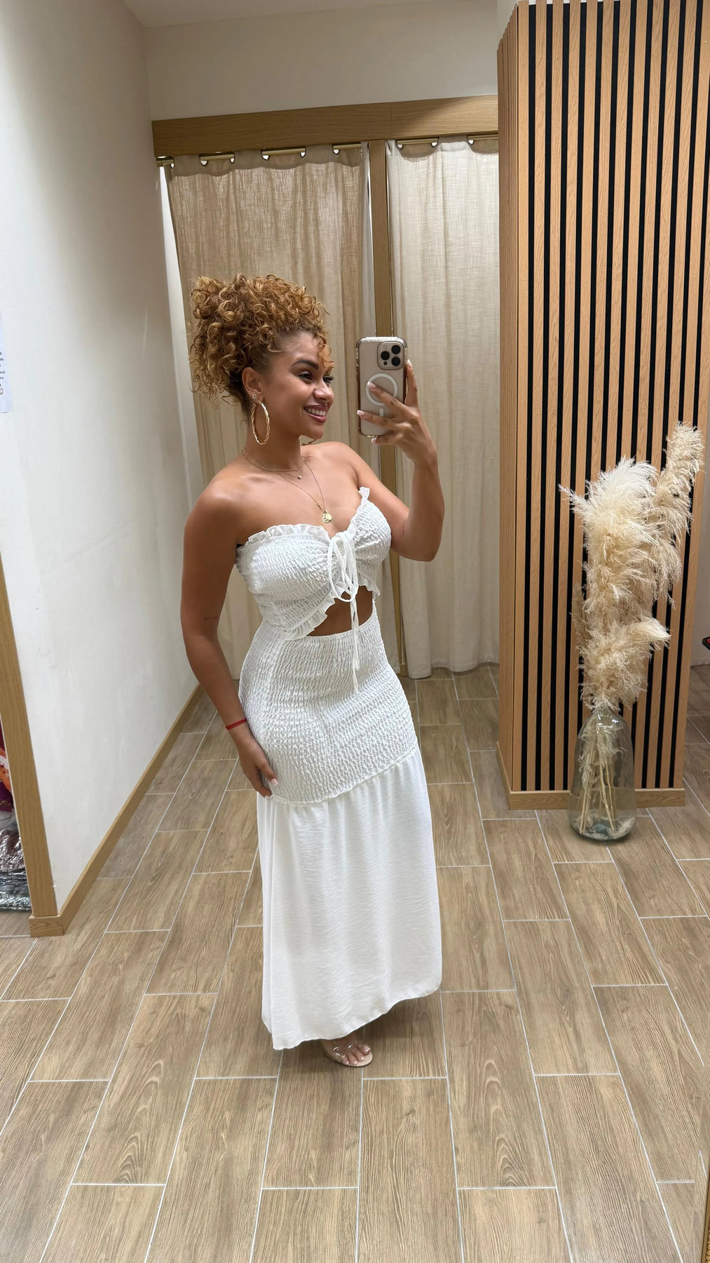 Fraîche et féminine, cette robe longue bustier révèle une élégance naturelle avec une pointe de modernité. Son haut smocké épouse les courbes avec confort tandis que son lien délicat vient souligner le buste avec subtilité. Fluide et aérienne, elle se prête aussi bien à une balade estivale qu’à une soirée décontractée, apportant une allure chic sans effort.