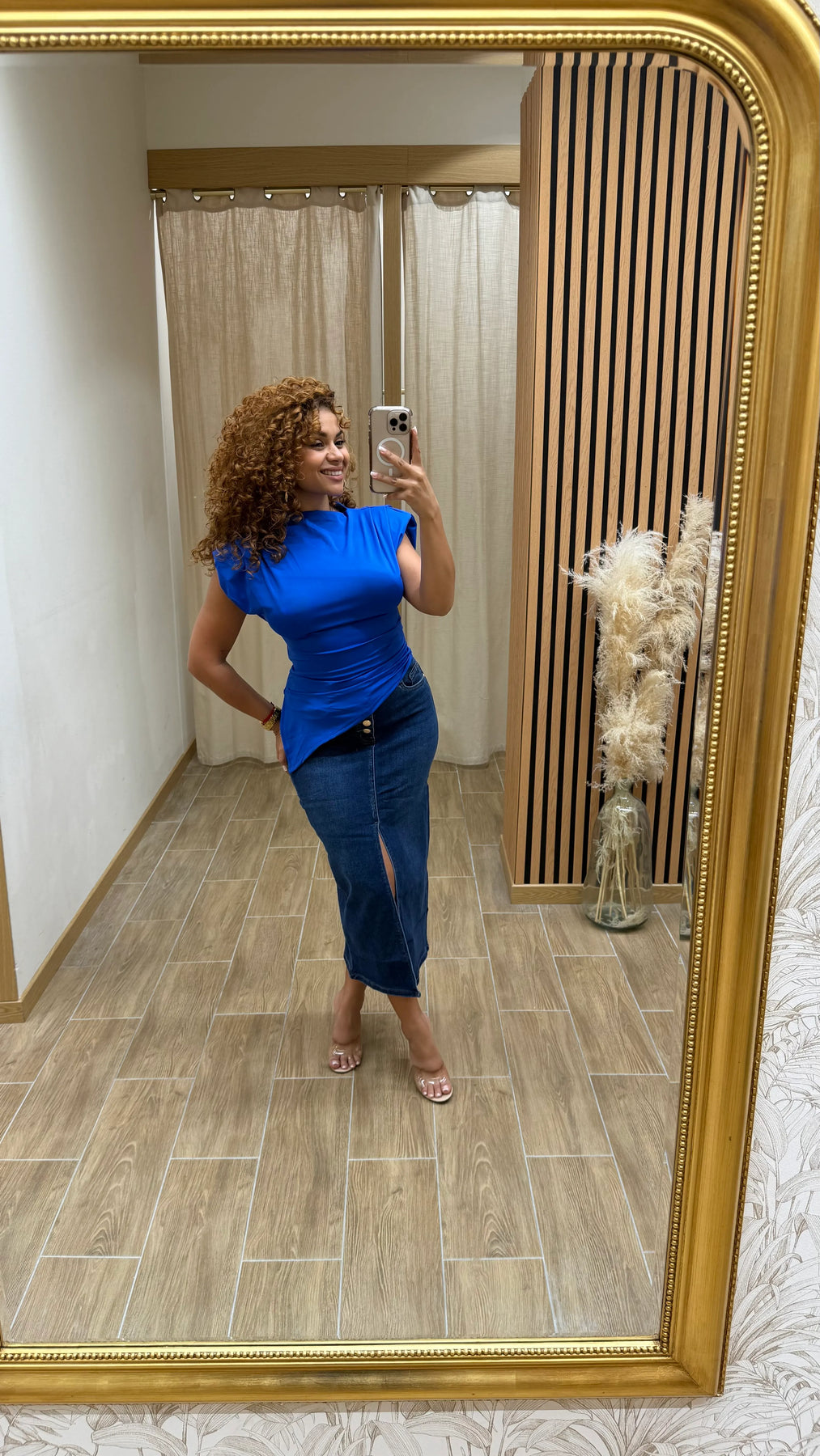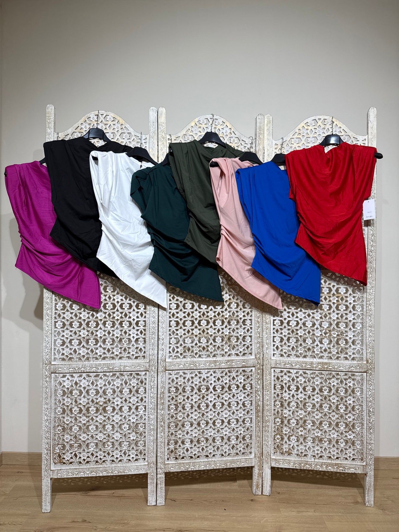 Original et audacieux, le top à épaulettes et coupe asymétrique apporte une touche mode affirmée à votre tenue. Sa structure bien pensée, avec des épaules marquées et une base en biais, sublime la silhouette tout en offrant un look contemporain et stylé. À porter rentré dans un pantalon taille haute ou sur un short pour un effet décontracté chic.