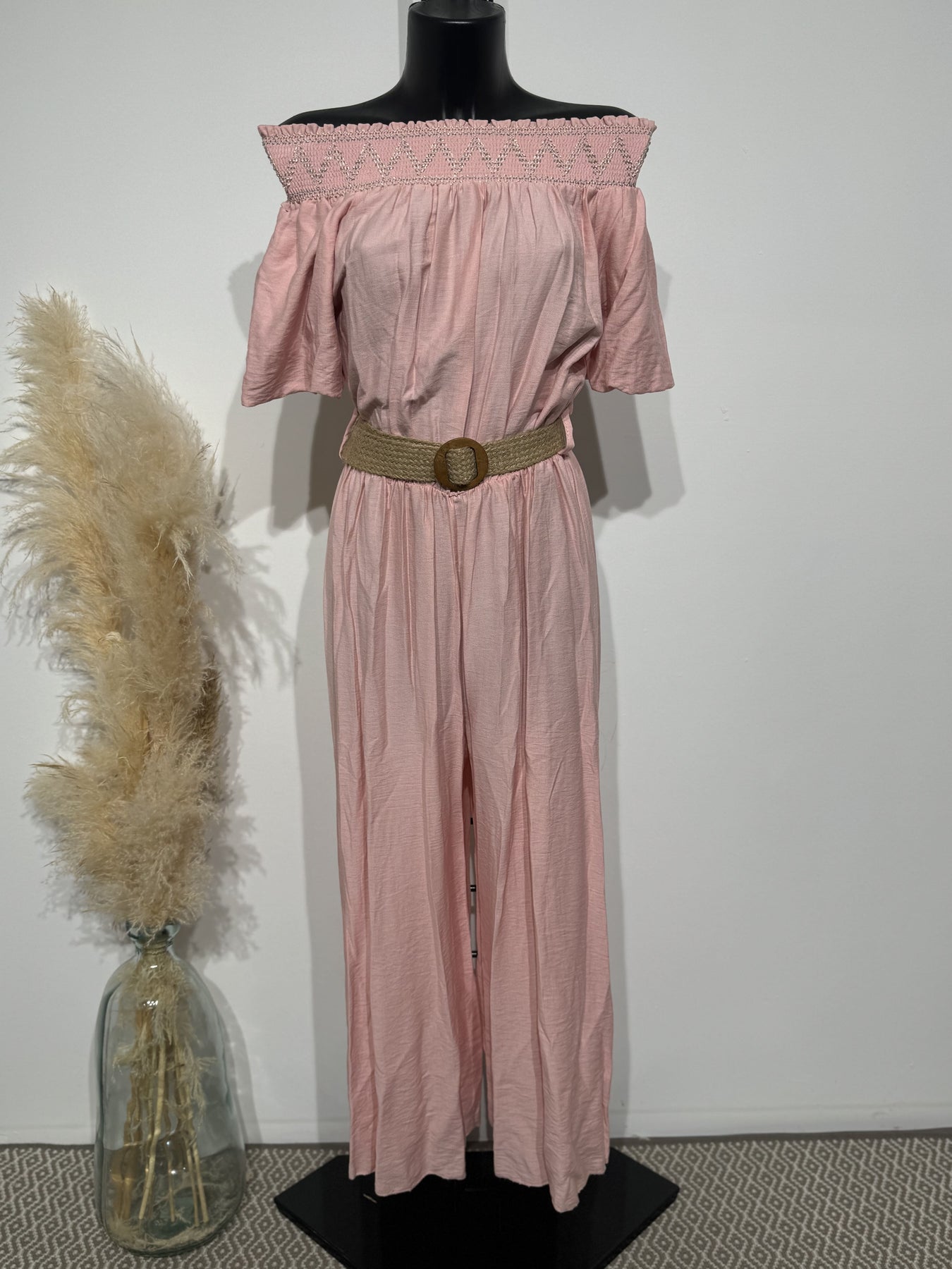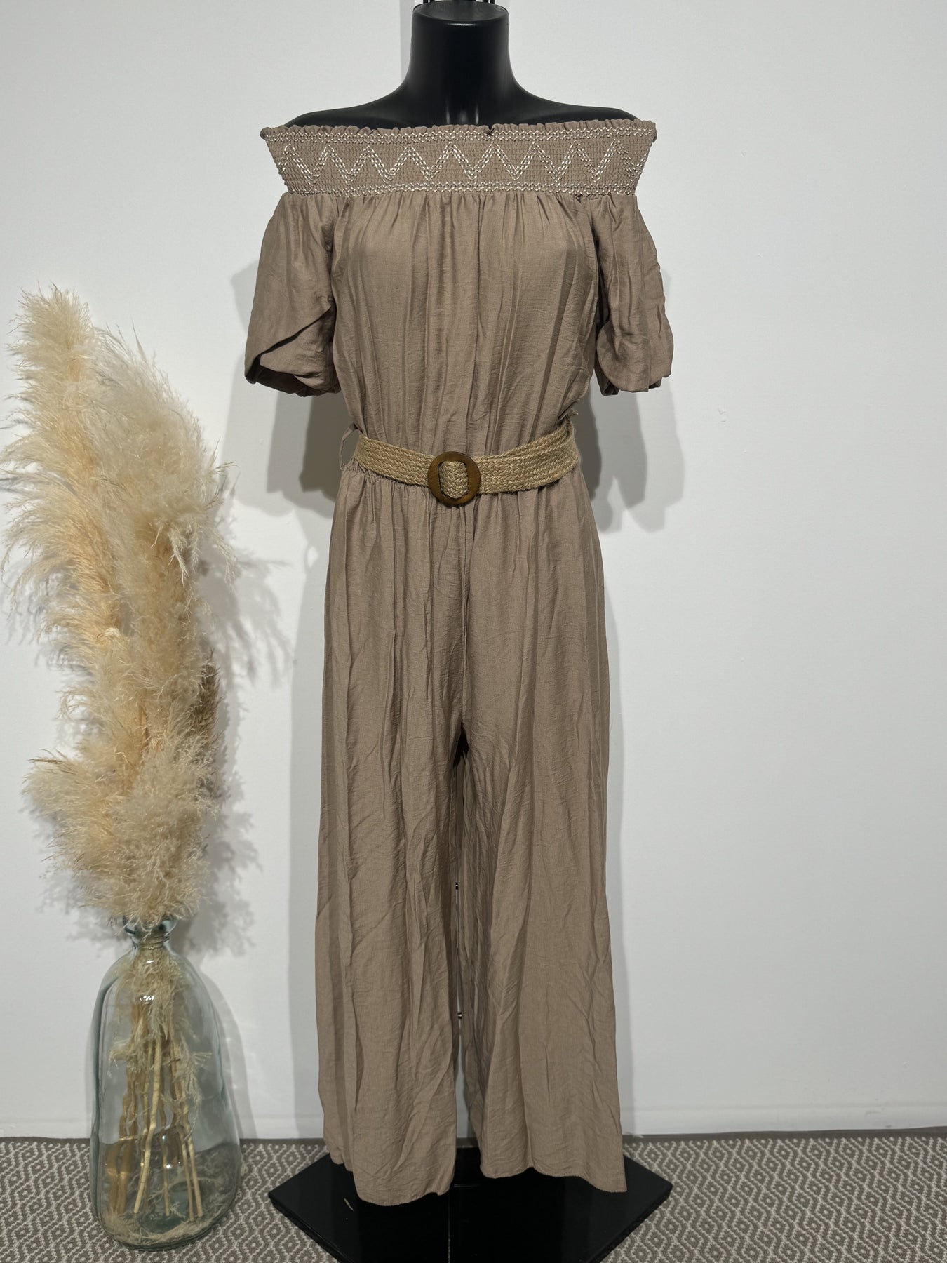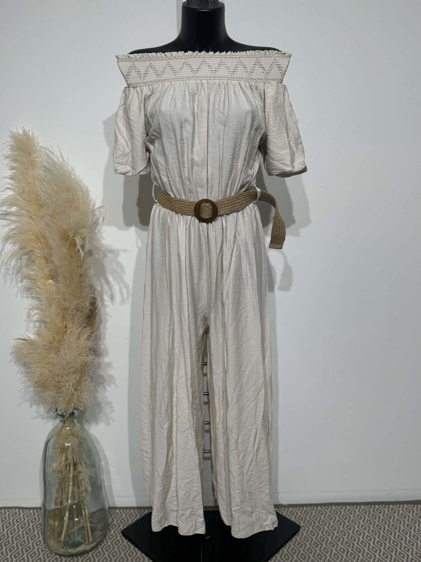 Allure bohème et élégante avec cette combinaison aux épaules dénudées. Laissez-vous séduire par son charme naturel et sa ceinture tressée ! 🌿.