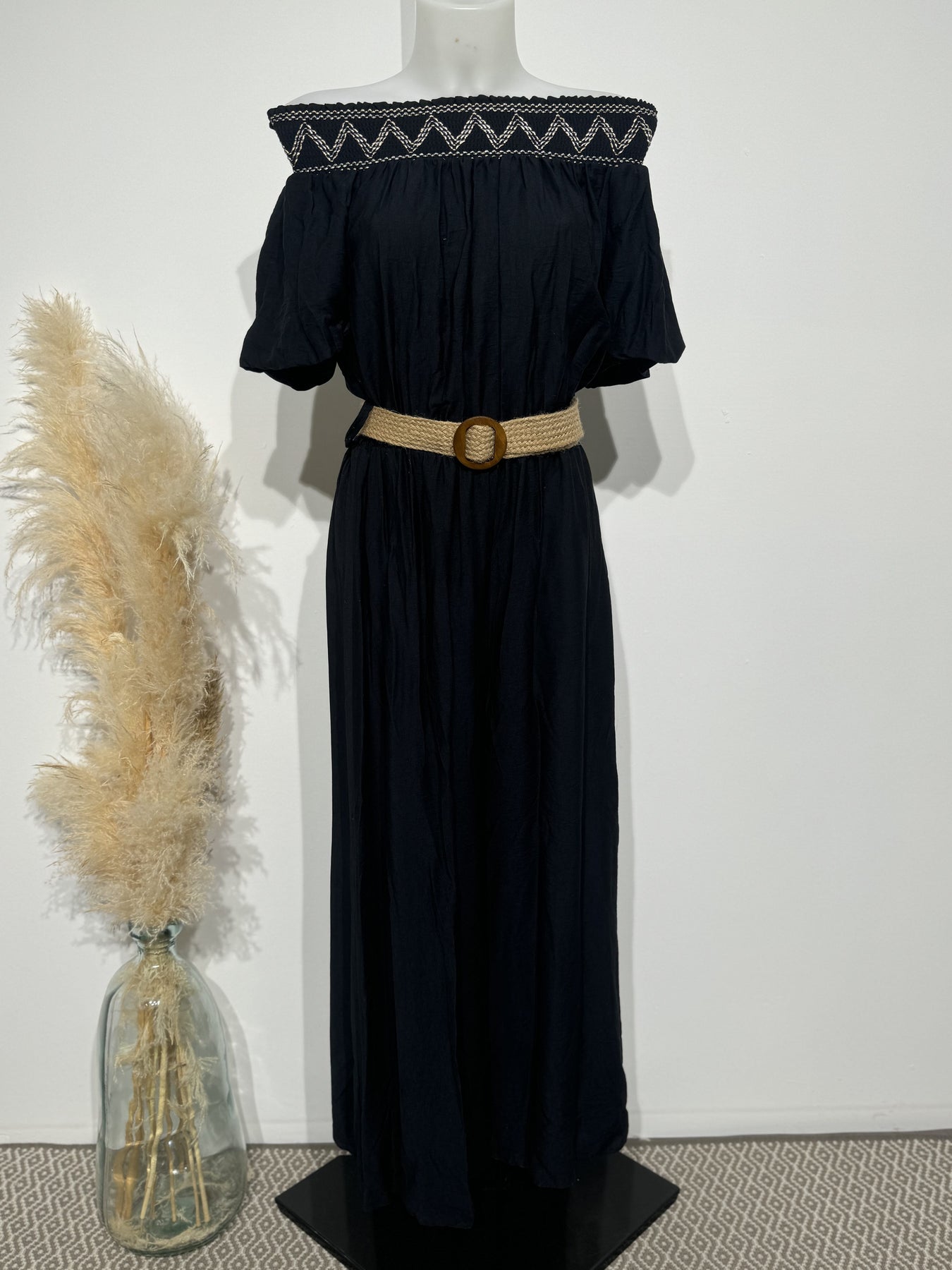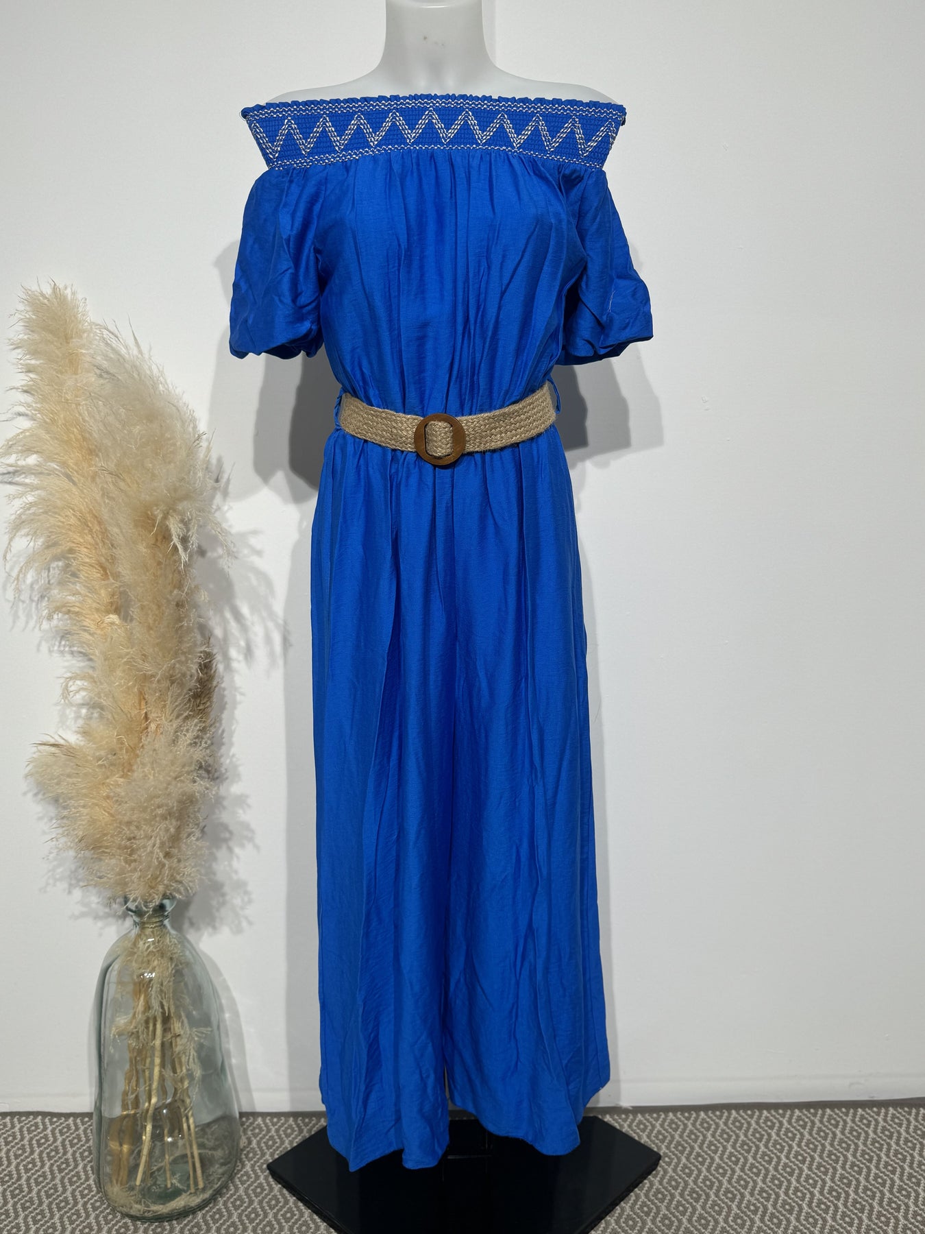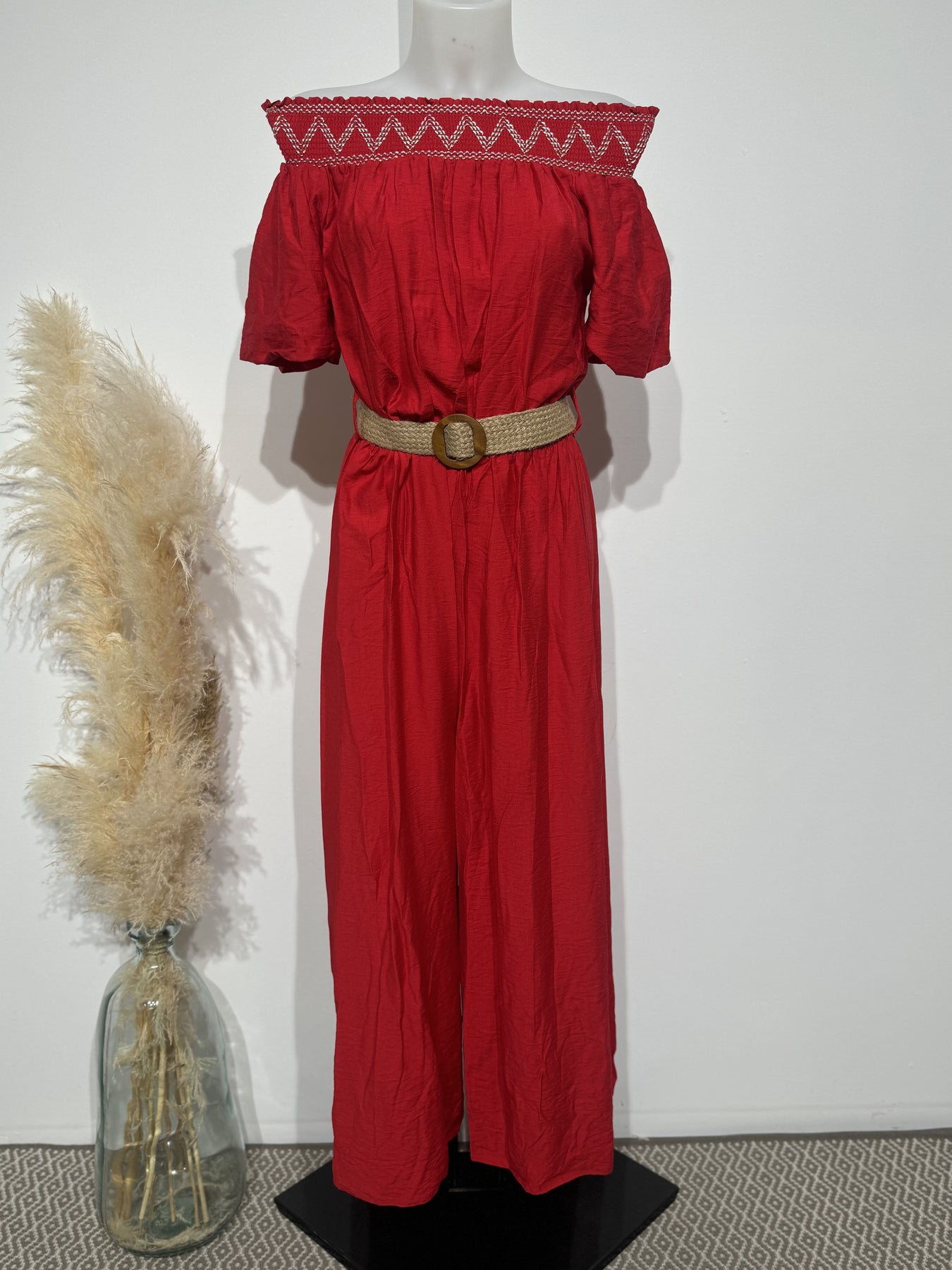 Allure bohème et élégante avec cette combinaison aux épaules dénudées. Laissez-vous séduire par son charme naturel et sa ceinture tressée ! 🌿.