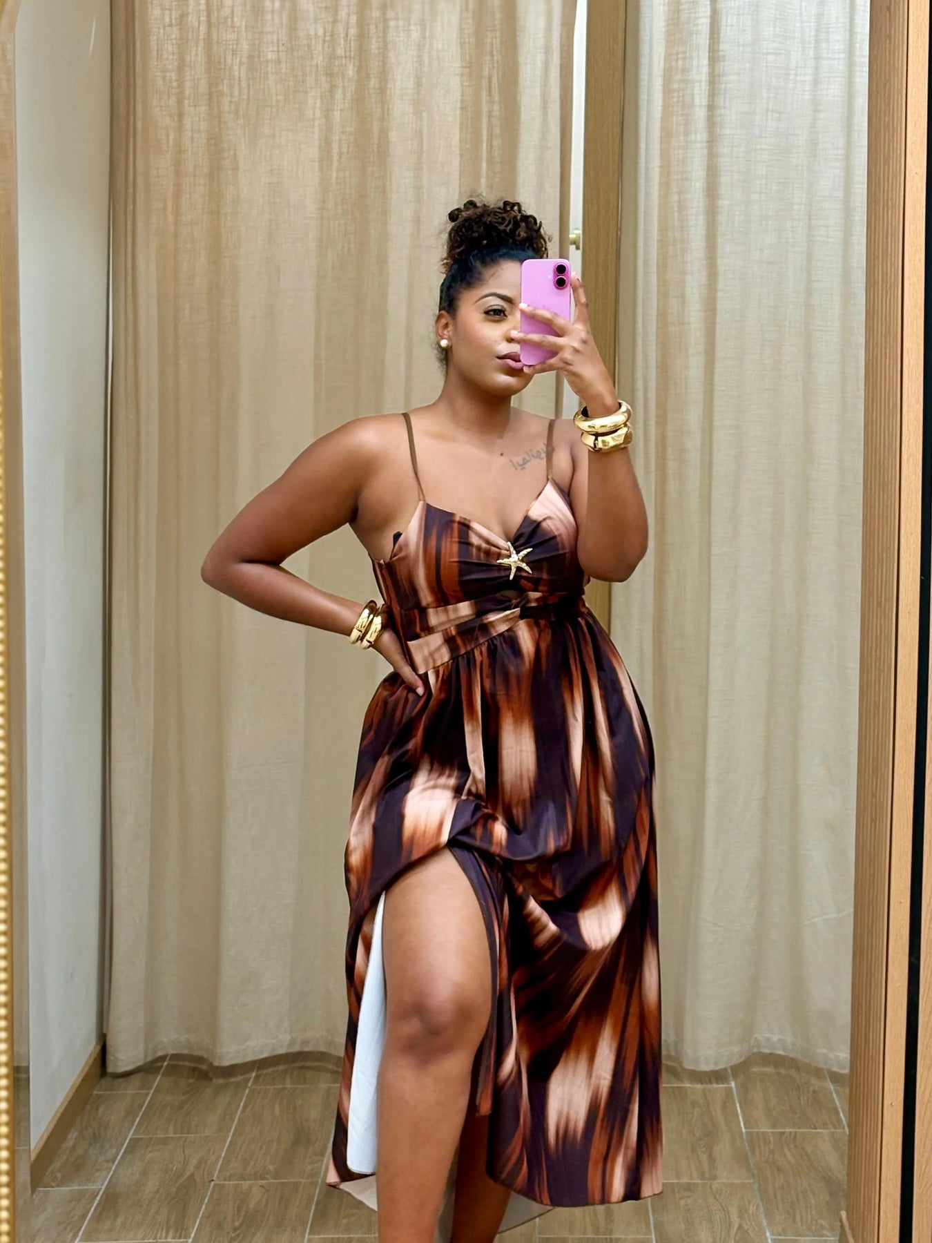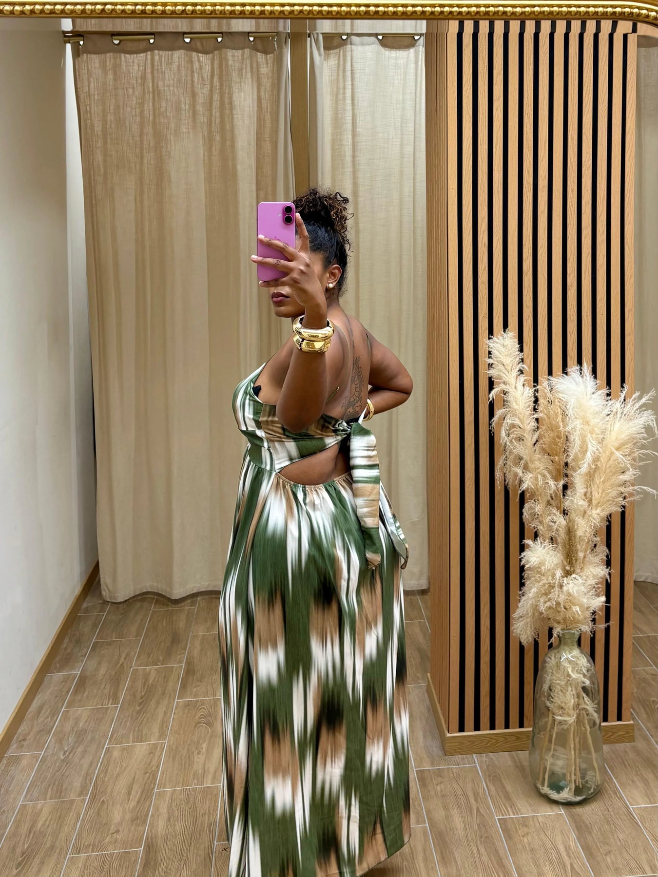 Légère et aérienne, cette robe longue dévoile une silhouette libre et féminine. Sa coupe fluide suit chaque mouvement avec grâce, tandis que son dos nu et son jeu de découpes subtilement placées invitent à la sensualité sans jamais renoncer à l’élégance. Idéale pour une soirée d’été, un mariage en plein air ou une escapade romantique au bord de la mer, elle incarne une allure bohème chic irrésistible.
